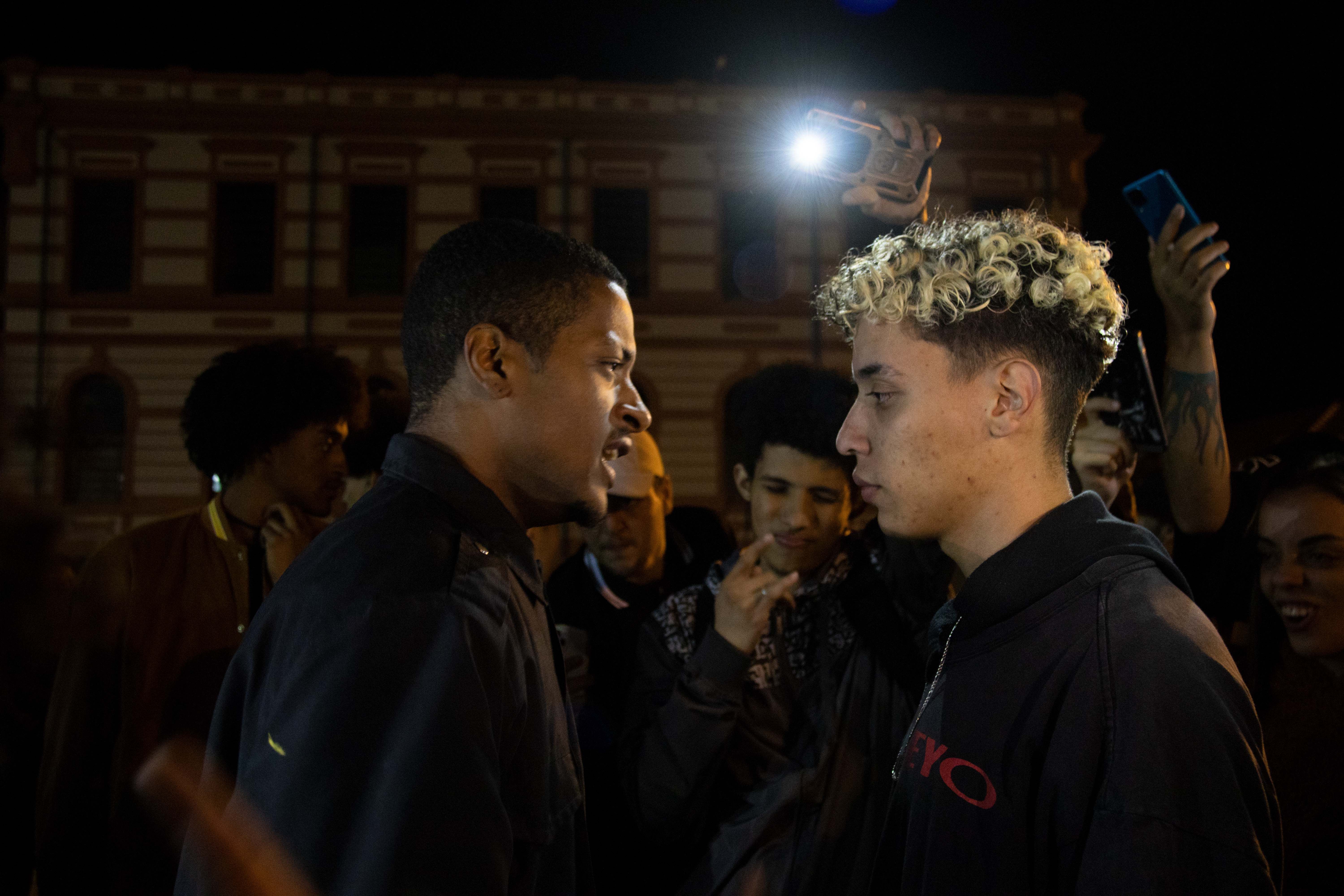 AniraM: Fazer cinema independente é sempre uma aventura. É cansativo, mas muito gratificante. Nossa equipe era pequena e fizemos tudo com os equipamentos que eu já tinha. Criei até uma lojinha para vender artes e conseguir comprar um gravador, já que, por ser um projeto independente e sem vínculo direto com a universidade, não podíamos usar os equipamentos do curso. A maior dificuldade foi a financeira; transporte, exibições, remuneração. Nada disso conseguimos garantir. O filme foi feito na força de vontade mesmo. Do nosso próprio bolso e energia, era juntar alguns amigos e fazer acontecer. Durante a roteirização, fizemos visitas técnicas para entender a iluminação das praças, já que tudo acontecia à noite e nossos equipamentos eram bem iniciais. Na pós, nosso editor e colorista, Matheus Eustáquio, conseguiu uniformizar tudo, incluindo os dois tipos de câmera: uma Canon SL3 em 4K e uma handycam que chegava a um 1080p bem sofrido. Mas isso virou estética. A divisão do filme - chegada, rounds, final, free do campeão - funciona bem com essa mistura, porque representa o cotidiano real de quem vive as rodas.