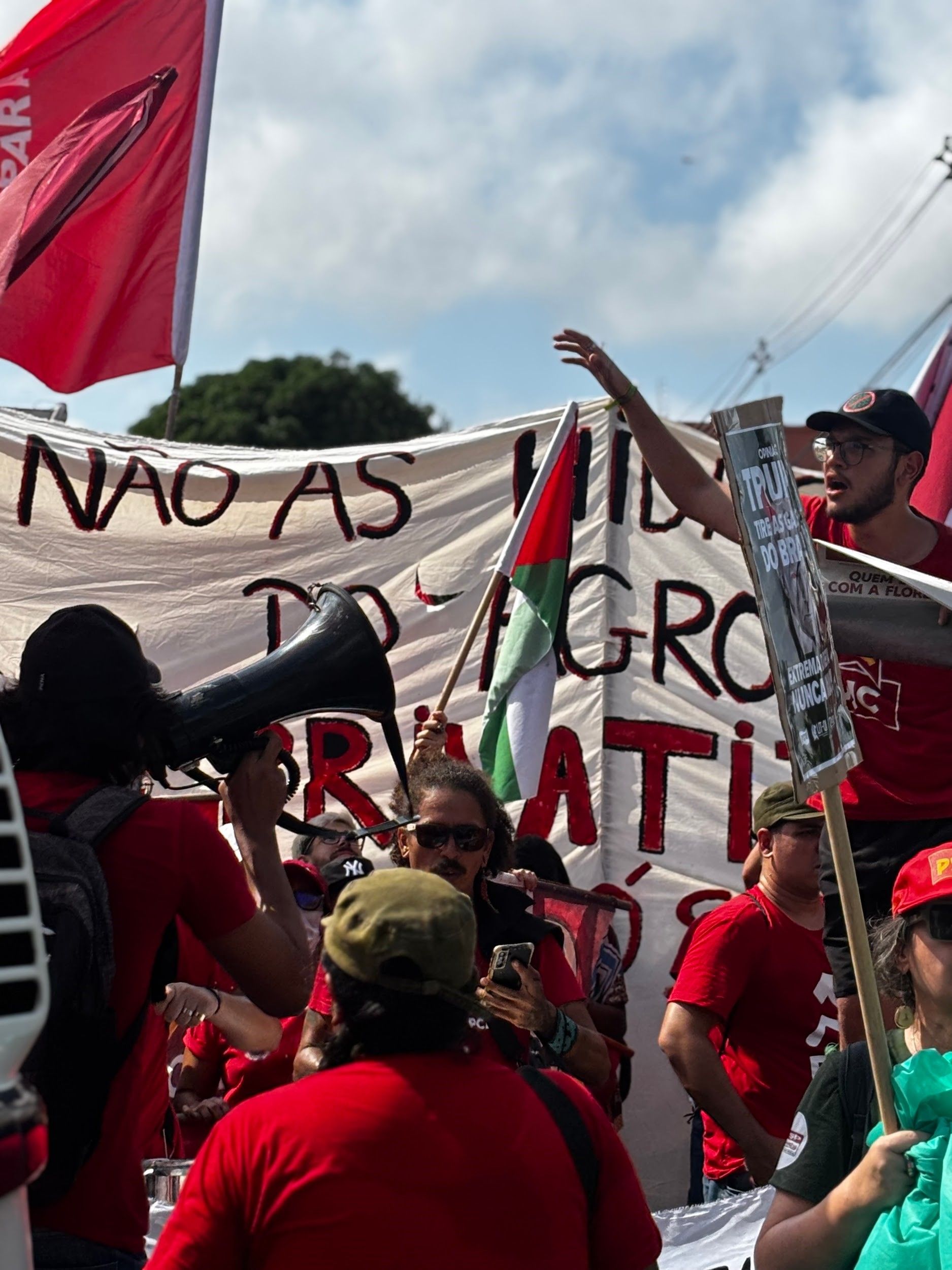 O PCBR e a UJC concentraram-se com outras organizações no Sindicato dos Trabalhadores da Construção Civil, às 7h da manhã, e marcharam em bloco unificado, denunciando o papel do capitalismo na destruição dos territórios e na produção da catástrofe ambiental.