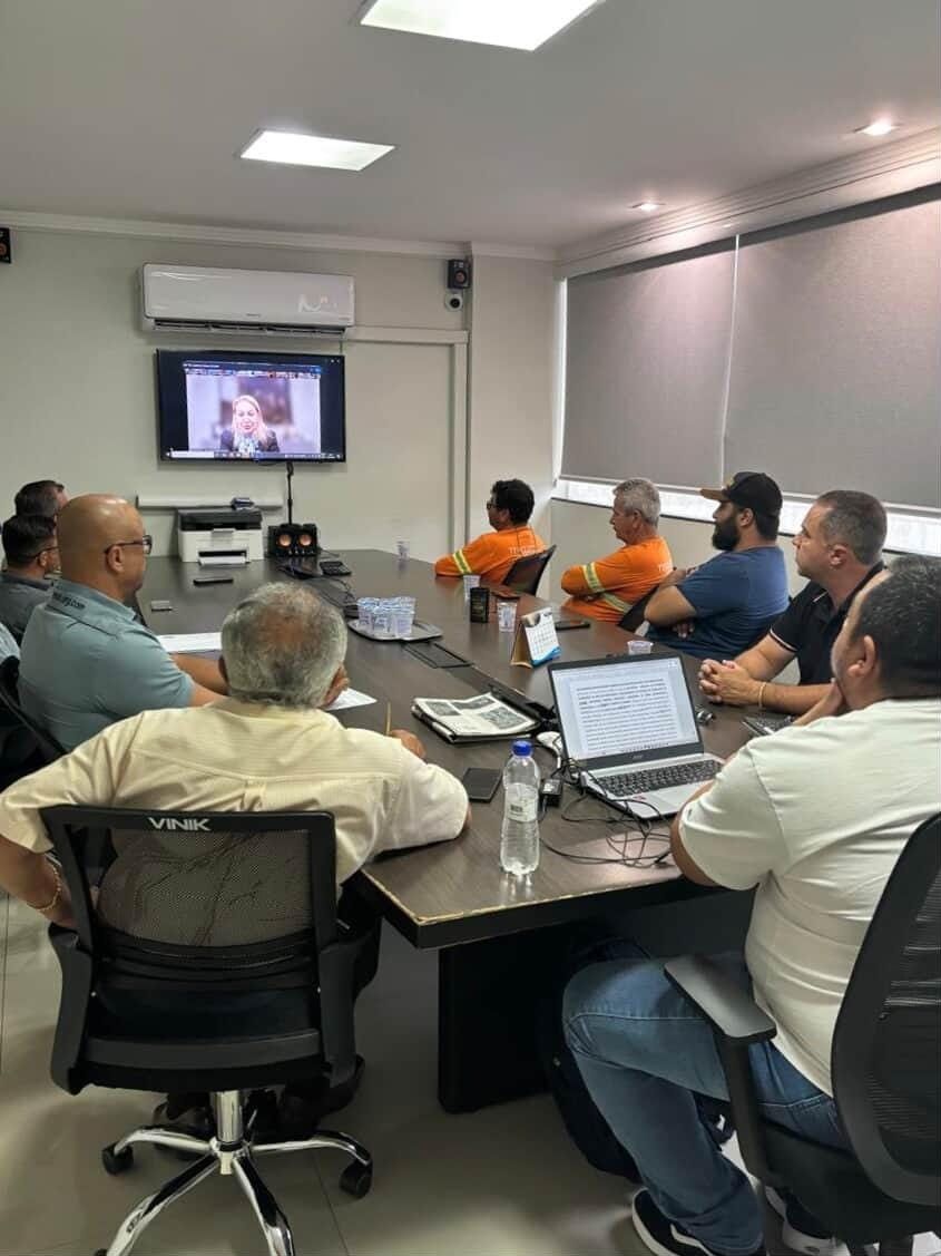 Audiência de dissídio coletivo, com presença do Sinttromar, trabalhadores da coleta de lixo e representantes da empresa. Reprodução/Foto: Sinttromar.