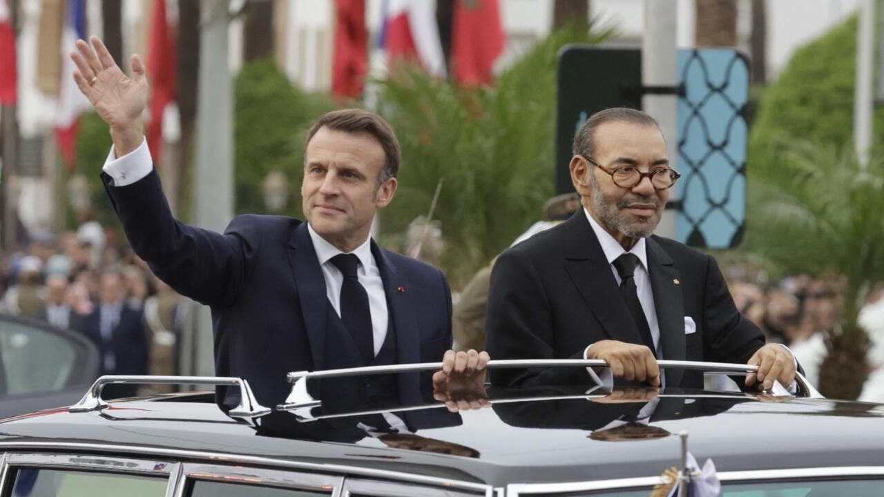 O presidente da França, Emmanuel Macron, desfila ao lado do rei Mohammed VI do Marrocos, em outubro de 2024, durante visita do francês à Rabat. Reprodução/Foto: Redes Sociais.