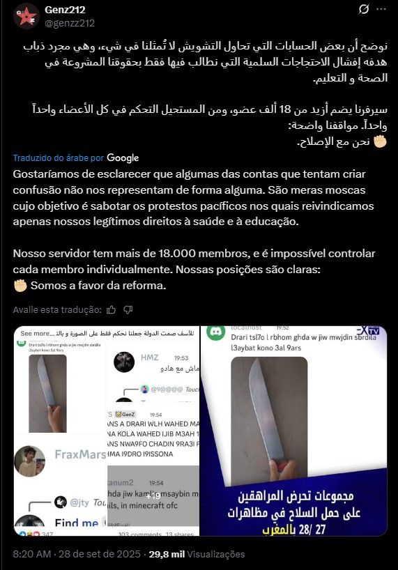 Paralelamente, o grupo GenZ 212, que se coloca como apartidário, reúne mais de 130 mil pessoas em um servidor da rede social Discord. Em declarações públicas, seus integrantes e idealizadores – que permanecem no anonimato – exigem a destituição do governo liderado pelo primeiro-ministro Aziz Akhannouch, no cargo desde 2021, além do fim da corrupção ligada a contratos de obras da Copa do Mundo.