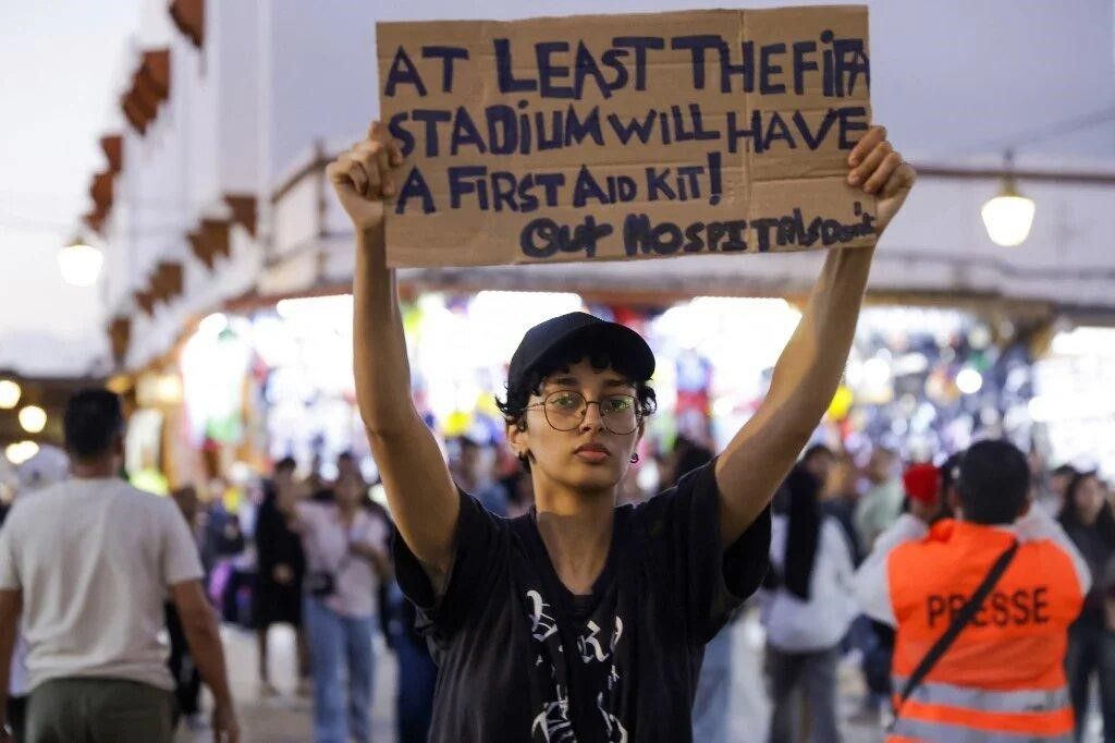 Manifestante em Rabat ergue cartaz em inglês reivindicando melhorias no sistema de saúde marroquino em contraste às obras dos estádios para a Copa. Reprodução/Foto: Middle East Eye.