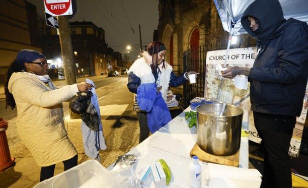 Skiippy (à direita), membro do Partido dos Panteras Negras para Autodefesa da Filadélfia, entrega sopa a Yolanda Gray (ao centro) e Roxanne Hart em frente à ‘Igreja do Advogado’, no norte da Filadélfia, na sexta-feira, 9 de janeiro de 2026. Reprodução/Foto: Yong Kim/The Philadelphia Inquirer/TNS.
