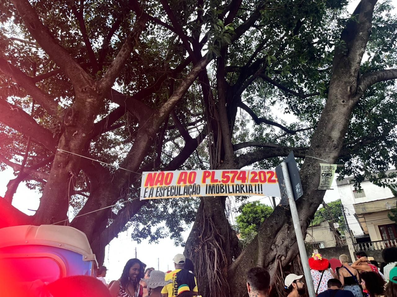 Faixa contra o PL da Especulação Imobiliária e em defesa das comunidades tradicionais no blocs de carnaval Afro Filhos das Águas (14/02). Reprodução/Foto: Bloco Afro Filhos Das Águas.
