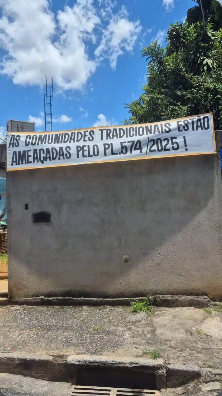 Faixa contra o PL 574/2025, em defesa dos bairros Concórdia, Lagoinha e Bonfim no bloco de carnaval Samba D’Ouro no Concórdia em Belo Horizonte. Reprodução/Foto: Natalie Matos.