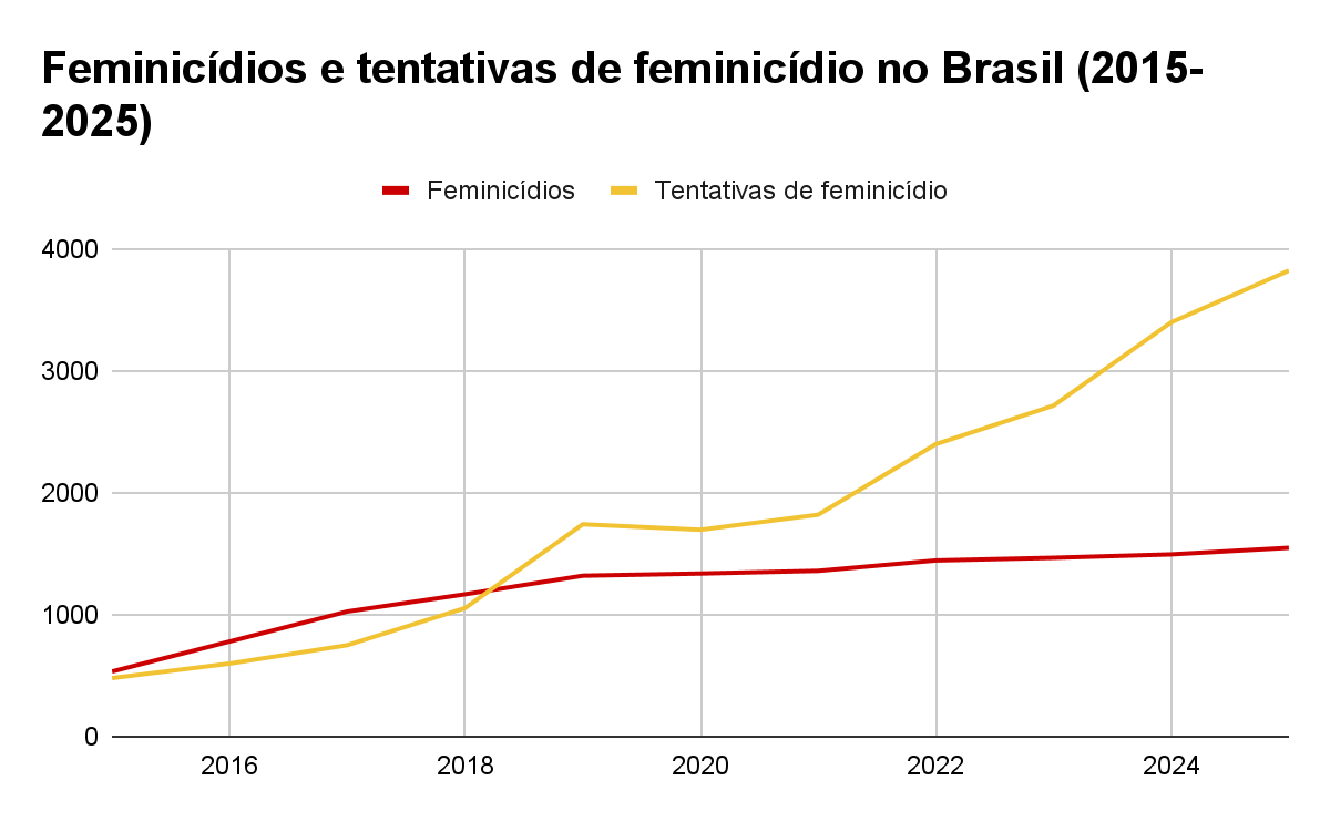 No primeiro ano de registros a taxa de vítimas por 100 mil mulheres foi de 0,66%, o que expressava o número de 534 mulheres vitimadas. Em 2025 a taxa foi elevada à máxima histórica de 1,42 vítimas por 100 mil mulheres. Nos deparamos, nesse mesmo período, com um crescimento de 189,89% no registro anual de feminicídios no país. Nos registros das tentativas de feminicídio, novamente entre 2015 e 2025, a elevação é ainda mais expressiva: 696,04%.