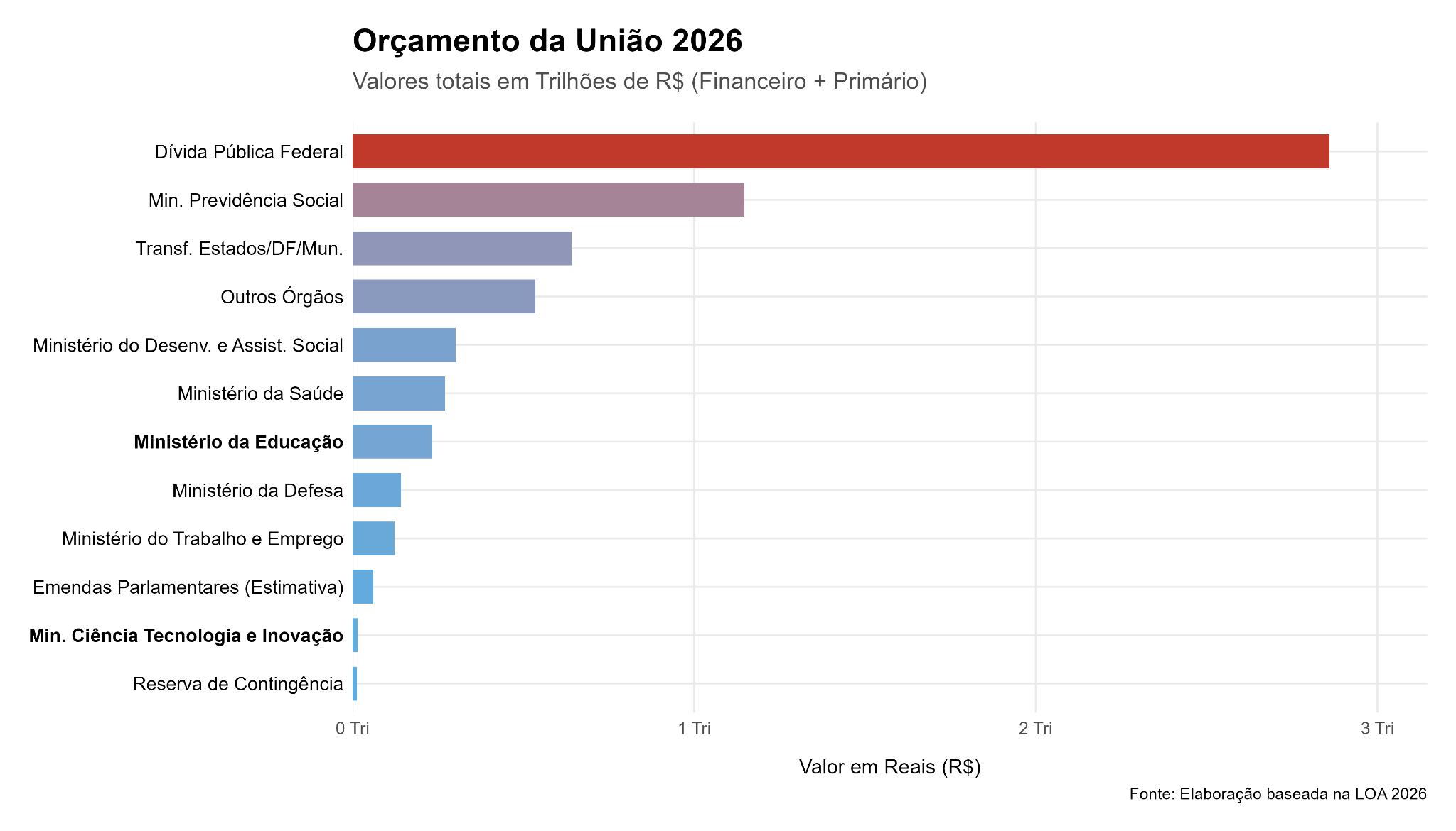 Figura 1: Distribuição do Orçamento da União em 2026 (valores totais). Educação e Ciência, Tecnologia e Inovação figuram entre as áreas com menor participação relativa nesse contexto. Fonte: Jornal O Futuro com base na LOA 2026.