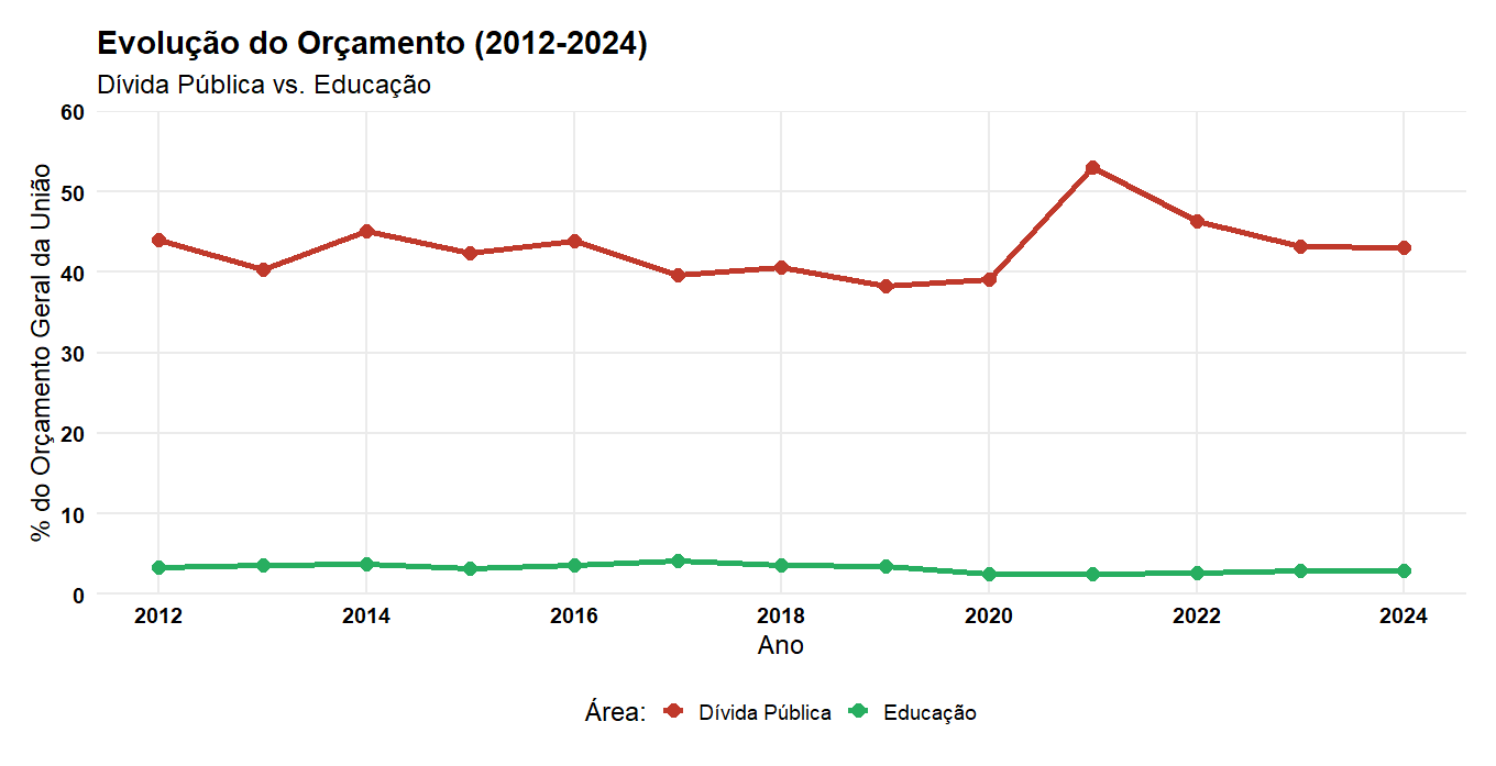 Figura 3: Mesmo em anos de expansão do gasto total da União, a participação da educação no orçamento executado apresenta tendência de queda ou estagnação ao longo da última década, caindo de patamares próximos a 3,7% em 2014 para cerca de 2,9% em 2024. Fonte: Jornal O Futuro com base em dados orçamentários da União.
