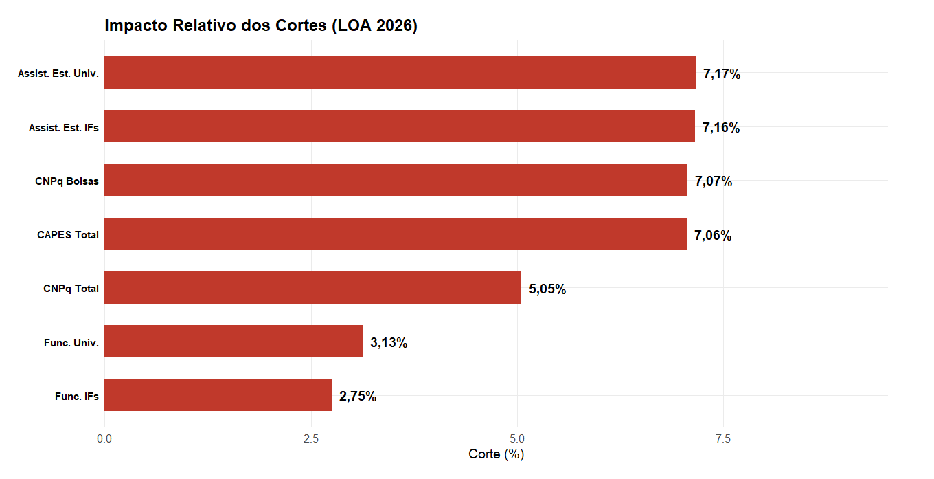 Figura 2: Impacto relativo dos cortes previstos na LOA 2026 — O gráfico evidencia que os maiores percentuais de corte incidem sobre políticas diretamente ligadas à permanência estudantil e à formação científica, com destaque para a assistência estudantil nas universidades e institutos federais e para as bolsas da Capes e do CNPq Fonte: Jornal O Futuro com base na LOA 2026.
