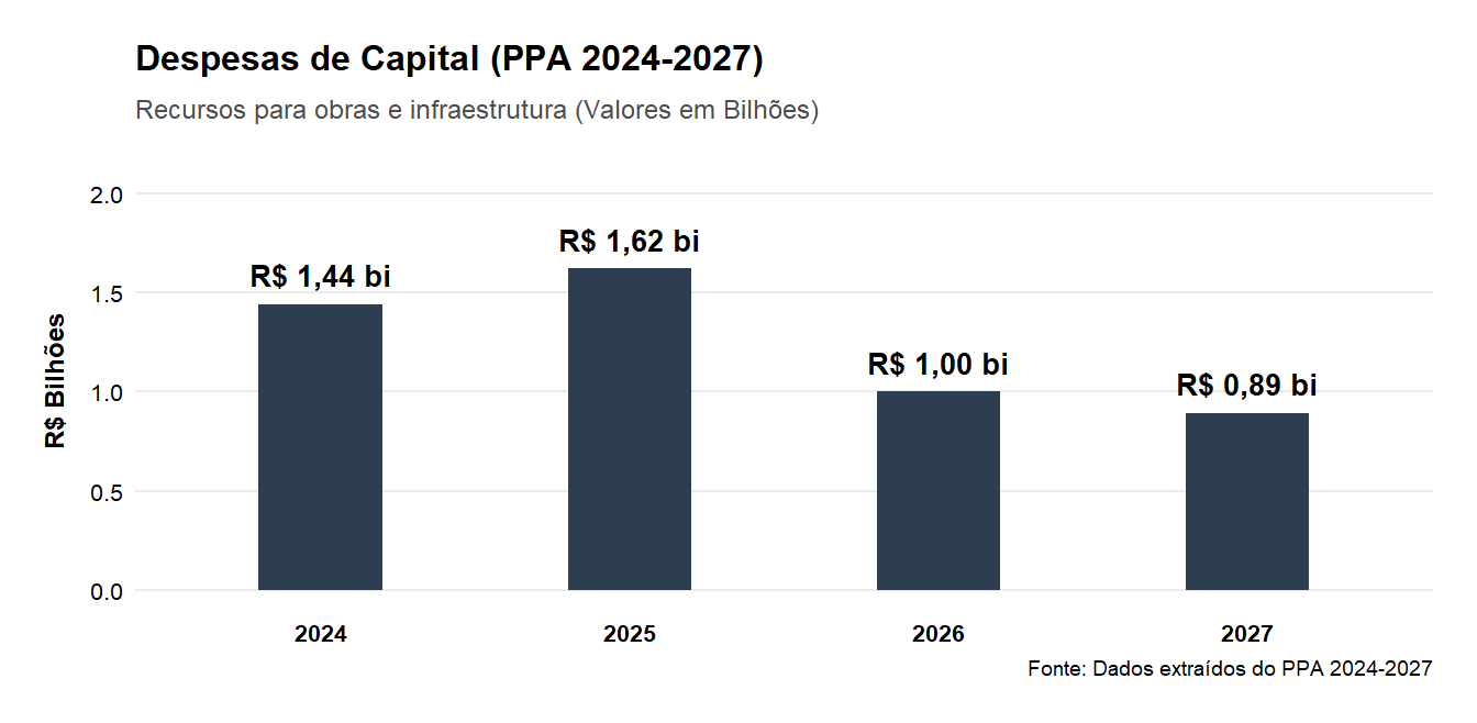 Figura 4: Projeção orçamentária para obras e expansão física das universidades e institutos. Após um pico em 2025, os recursos sofrem uma queda drástica de quase 40% em apenas um ano. Fonte: Jornal O Futuro com base no PPA 2024- 2027