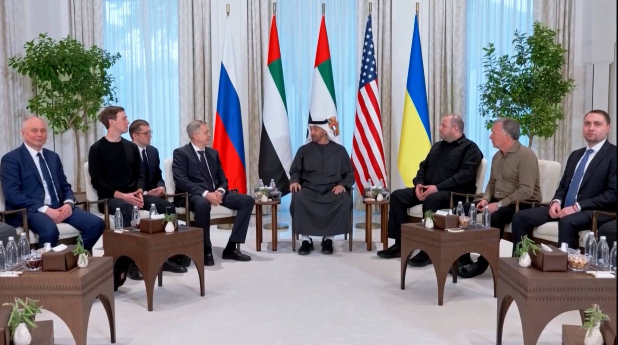 Mesa de negociações em Abu Dhabi, entre os governos ucraniano, russo e estadunidense. Reprodução/Foto: Governo dos Emirados Árabes Unidos/REUTERS.