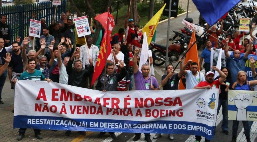 Protesto contra venda da Embraer para a Boeing, em 2018. Reprodução/Foto: Manuela Moraes/SindmetalSJC.