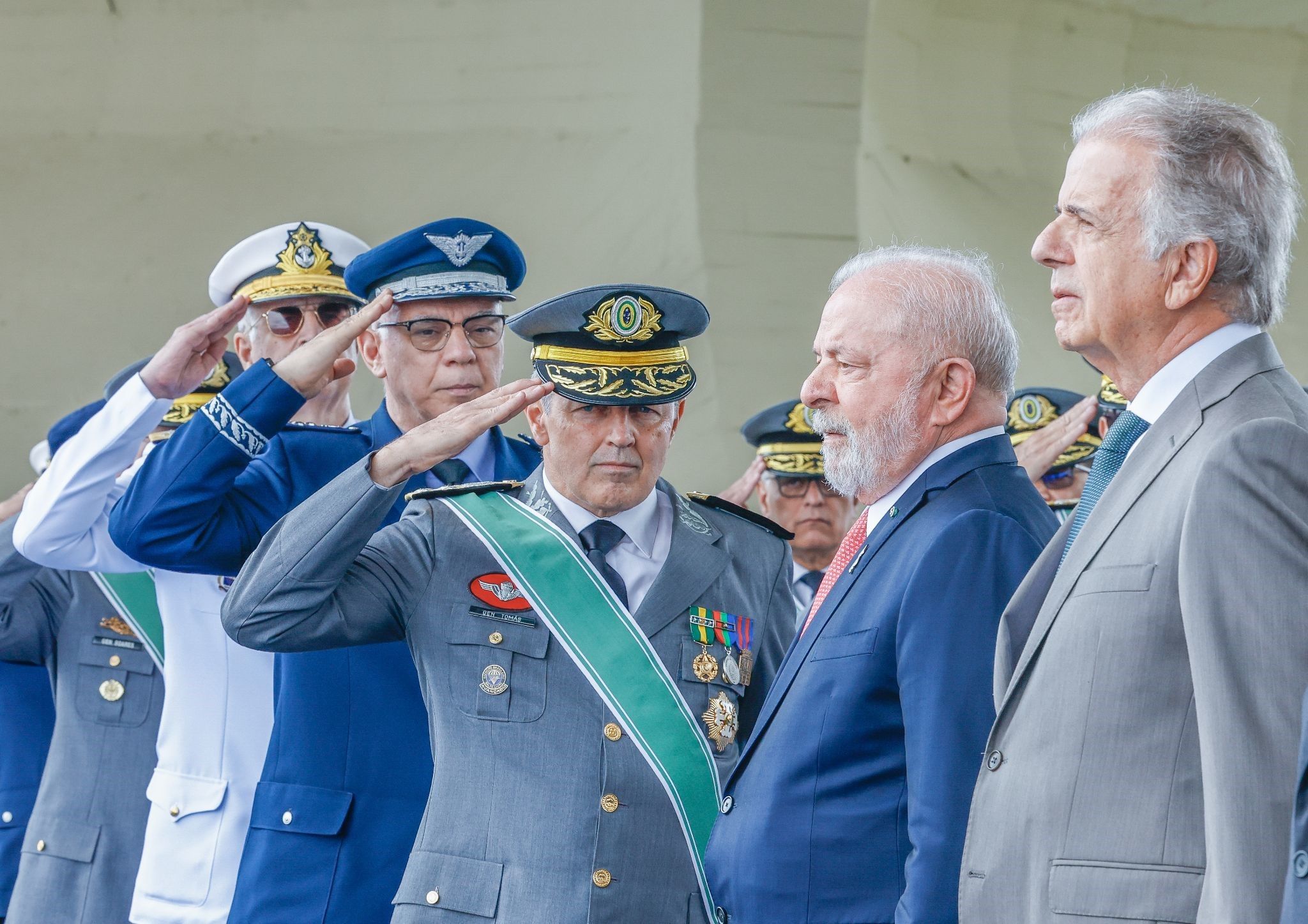 Comandantes da Marinha, da Aeronáutica e do Exército ao lado do Presidente Lula e do Ministro da Defesa, José Múcio. Reprodução/Foto: Ricardo Stuckert/PR.