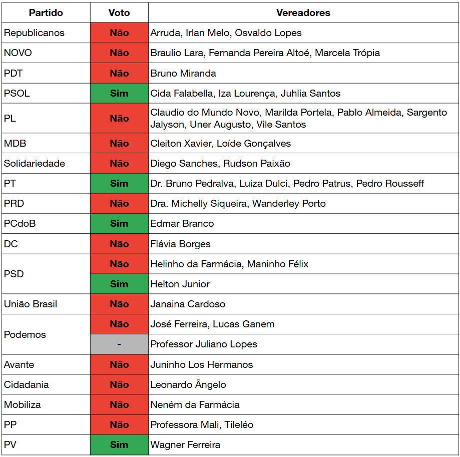 A rejeição segue a orientação do prefeito Álvaro Damião, que já havia indicado que vetaria o PL caso fosse aprovado. Mesmo com 22 assinaturas no Projeto de Lei protocolado em fevereiro, apenas 10 votos foram favoráveis e 30 contrários. Dentre aqueles parlamentares que mudaram de posição ou que não estiveram presentes na votação, submetendo-se às pressões empresariais e da PBH, estão vereadores do Cidadania, MDB, Republicanos, Solidariedade, Podemos, PDT, PRD, PP e União Brasil. Como forma de retaliação, na última semana o vereador Helton Júnior (PSD) foi retirado do cargo de vice-líder de governo na Câmara e servidores públicos aliados aos vereadores que se posicionaram favoráveis à tarifa zero foram exonerados neste sábado (04/10). Confira a seguir como cada vereador se posicionou: