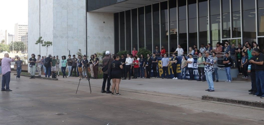 Ato contra a jornada de 8h em frente ao Edifício Sede III do Banco do Brasil. Reprodução/Foto: SEEB-DF.