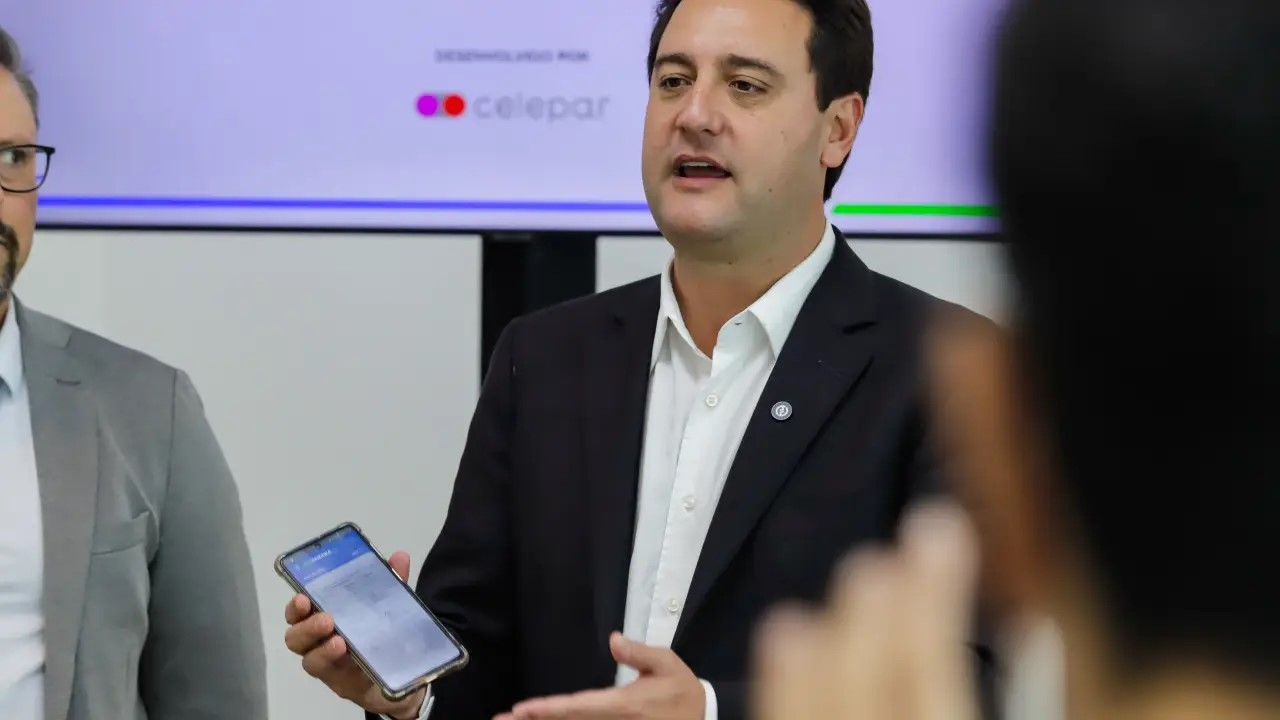 O governador Ratinho Jr durante lançamento do aplicativo Sou Paraná Conecta, desenvolvido pela Celepar. Reprodução/Foto: Roberto Dziura Jr/AEN.