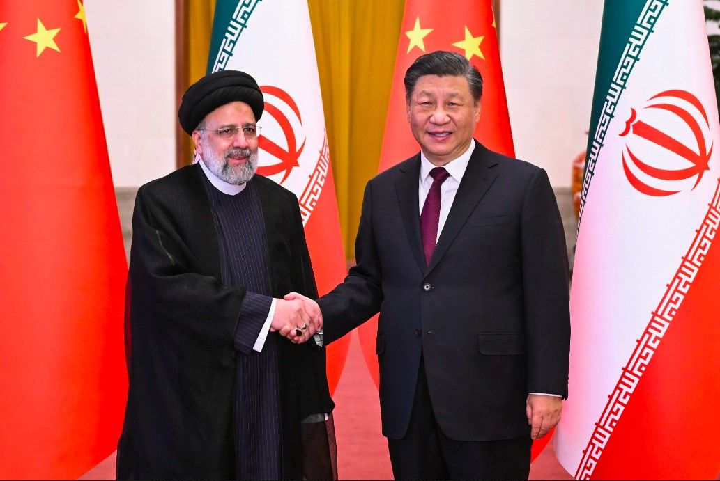 O presidente iraniano Ebrahim Raisi, à esquerda, aperta a mão do presidente chinês Xi Jinping, em 14 de fevereiro de 2023. Reprodução/Foto: Yan Yan/Xinhua.
