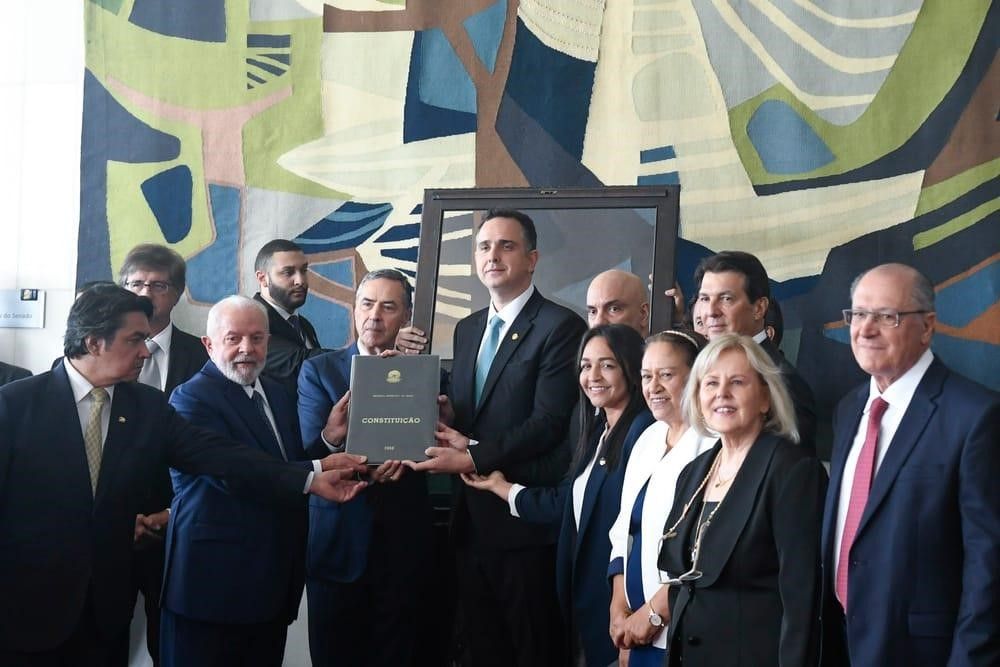 Foto de representantes dos três poderes em Brasília. Em destaque, o presidente da República, Luiz Inácio Lula da Silva, e os ministros do STF, Luís Roberto Barroso, Alexandre de Moraes e a ex-presidente do tribunal, Rosa Weber. Reprodução/Foto: Jefferson Rudy / Agência Senado.