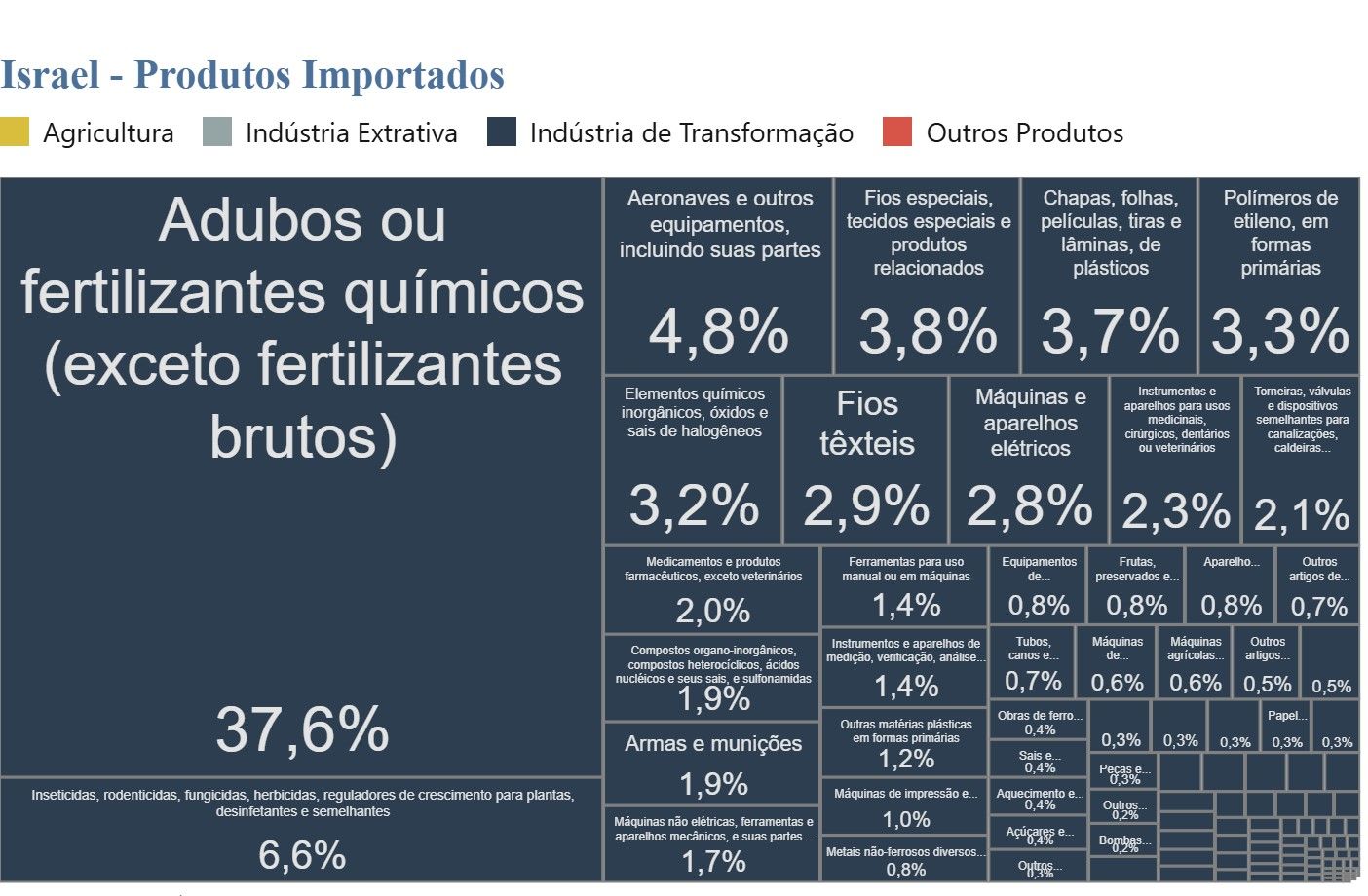 Os dados de 2024 do Ministério do Desenvolvimento, Indústria, Comércio e Serviços, apontam que as relações entre os dois países somam mais de US$1,2 bilhão (aproximadamente R$6,48 bilhões), uma baixa de 14,9% em relação a 2023/2024. Entre os principais produtos que o Brasil importa de Israel, destacam-se os insumos dos grupos dos fertilizantes (37,6%) e dos inseticidas (6,6%), além de aeronaves, equipamento bélico e diversos outros produtos da indústria têxtil, tecnológica e da construção civil.