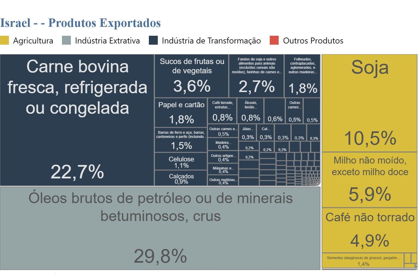 As exportações, por outro lado, tiveram um aumento de 9,6% em relação ao período anterior, chegando a US$725,1 milhões (quase R$4 bilhões). Os principais setores beneficiários das exportações para Israel encontram-se o agronegócio - com a Agricultura “bruta” (como soja, milho, café não torrado, etc.) e produtos da Indústria de Transformação (como carnes, sucos, cafés torrados, etc.) - e o setor da Indústria Extrativa, com destaque para óleos brutos de petróleo e minerais betuminosos.