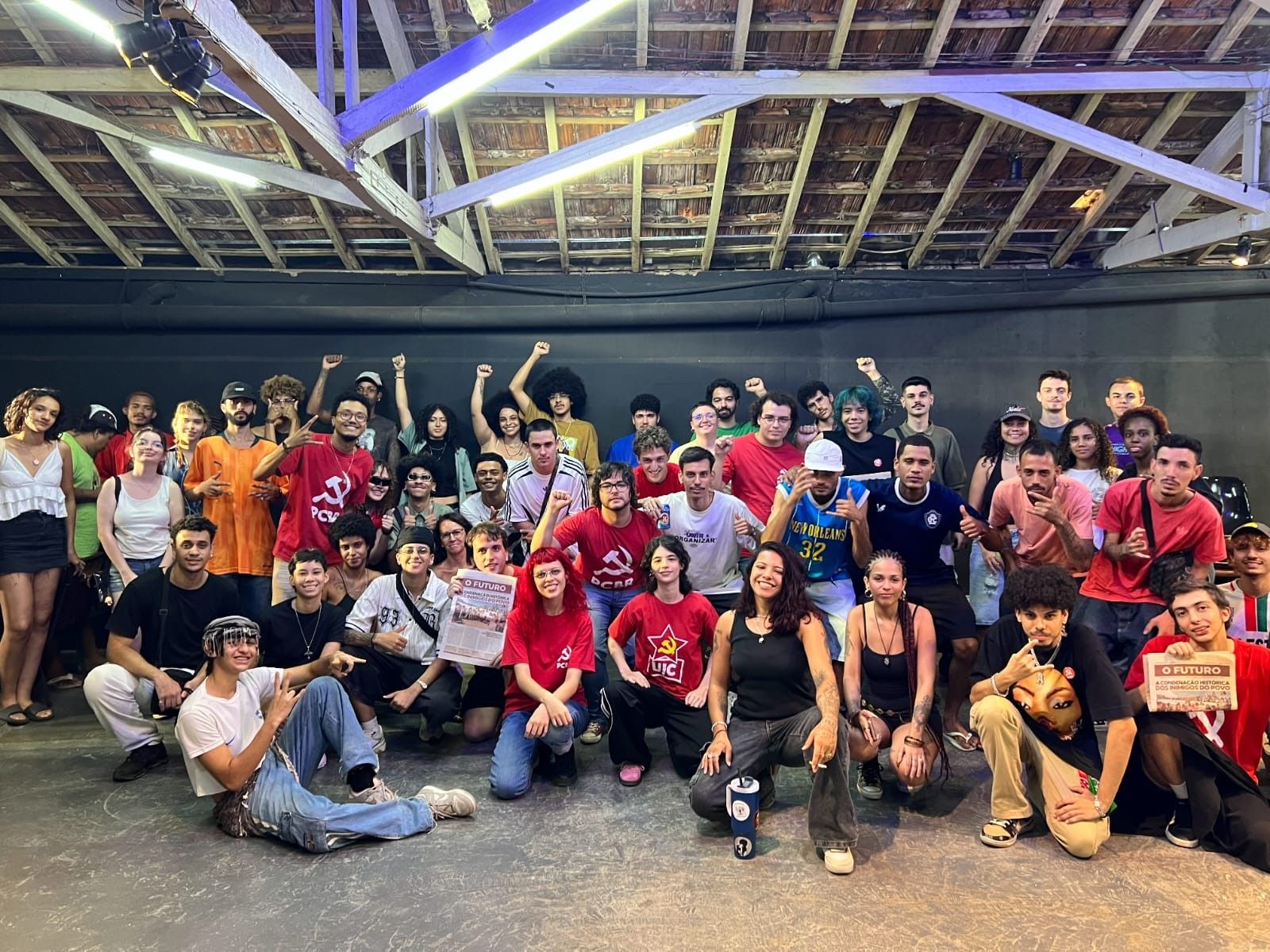 Foto com os participantes do evento, incluindo coletivos de hip-hop e militantes do Partido Comunista Brasileiro Revolucionário (PCBR). Foto: Jornal O Futuro.