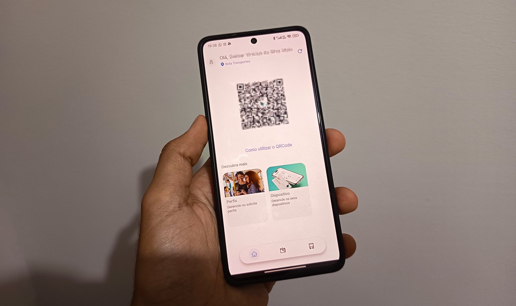 Funcionalidade do aplicativo Bipay, utilizado pela empresa para gerenciar o acesso aos ônibus e acompanhar os horários da frota. O aplicativo gera um QR code novo a cada poucos segundos no smartphone, que, quando escaneado e reconhecido pelo aparelho no ônibus, libera a passagem pela catraca. Foto: Jornal O Futuro.